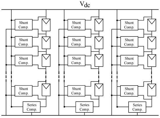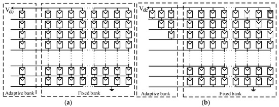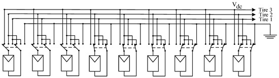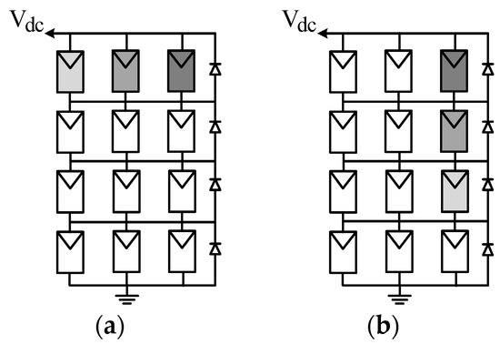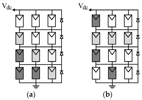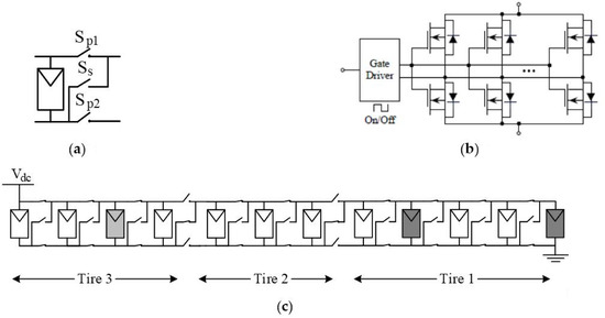 The strategy of String-Configured DPVA (SC-DPVA) [23], see Figure 8a, is configuring the normally insolated modules into SP array connected to the high dc voltage bus, whereas all the shaded modules are reconfigured into a single (parallel) tier. A step-up dc–dc converter is used to match the low voltage of the tire to the high-voltage dc bus while maximizing the power yield.