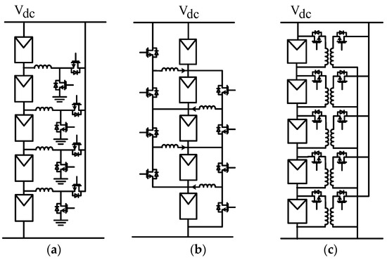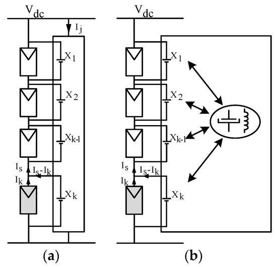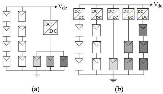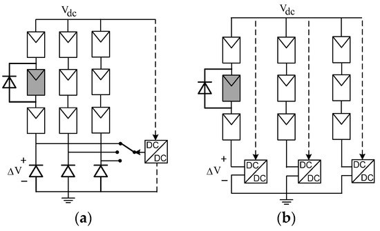 The SP array of a centralized inverter can be modified by applying the strategy of series voltage compensation [34]. When a module within a string is shaded, it becomes shorted by its bypass diode; therefore, the string voltage drops by a certain ΔV. Upon detection of the event and using a commutation relay, a low-power dc–dc converter can be introduced in series with a weak string—see Figure 15a. The series dc–dc converter (fed off the bus voltage Vdc) can lift its output voltage to compensate for the required voltage difference ΔV and restore the voltage of the problematic string. This allows the energy generation capability of the rest of the string to be exploited. A modification of this scheme, having a dedicated converter per string, was introduced by [35] applying a converter per string, as in Figure 15b. This solution eliminates the blocking diodes, the relays, and their associated controls and provides for greater flexibility, yet, at the cost of multiple power stages. A similar concept of a PV balancer was investigated by [36].
