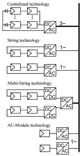 Another key component of any solar energy generation plant is the electronic power inverter. The inverter’s task is interfacing the solar energy to the grid. This involves maximum power point tracking (MPPT) function to maximize the captured energy, converting the dc voltage obtained from the PV array into AC, and injecting it to the grid in compliance with the high-power quality standards, i.e., at high power factor and minimum harmonic distortion. The inverter’s architecture is concerned with the implementation of a certain operational strategy of a PV array that can maximize its energy output. Four major PV inverter concepts, shown in Figure 11, are the centralized inverter, the string inverter, the multi-string inverter, and the micro-inverter [25]. The centralized inverter system is designed to connect a large SP array to the grid. SP array can provide sufficiently high voltage and high power, which justifies a three-phase grid connection with the additional advantage of reduced dc–ac power decoupling requirements.