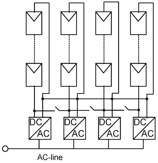 The TEAM concept [26] can be applied to multi-string inverters. With this concept, the master inverter and several slave inverters can share their PV strings using only a limited number of switches on the dc bus, as shown in Figure 12. In normal conditions, each inverter operates independently of its PV string under its MPPT and generates close to its rated power. Under a lower insolation level, the master can shut down one or several slaves while assigning their PV strings to the input of the adjacent slave. At very low insolation, only the master inverter remains operational. Shutting down the slaves allows inverter losses to be reduced and helps to improve the system’s efficiency at lower irradiation levels.