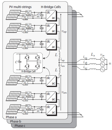 Due to their lower switch voltage stresses and higher quality of output waveform, multilevel inverters have become increasingly popular in recent years [31]. The cascaded H-bridge multilevel inverter relies on modular design and requires multiple isolated sources, which may be equal or unequal in their magnitude. This feature is particularly suitable for PV applications where multiple PV arrays can be used as isolated dc sources [32]. Grid-connected three-phase modular multilevel converter for a large-scale multi-string photovoltaic energy conversion system is illustrated in Figure 14 [33]. The idea can be regarded as a combination of centralized and multi-string approaches. The PV strings were composed by the series connection of several PV modules, to reach the desired voltage level and then paralleled, via the dc–dc stages, to meet the desired power rating of the power plant. The power balance of the PV arrays was attained by choosing an appropriate modulation strategy.