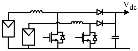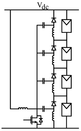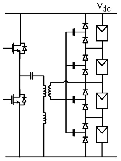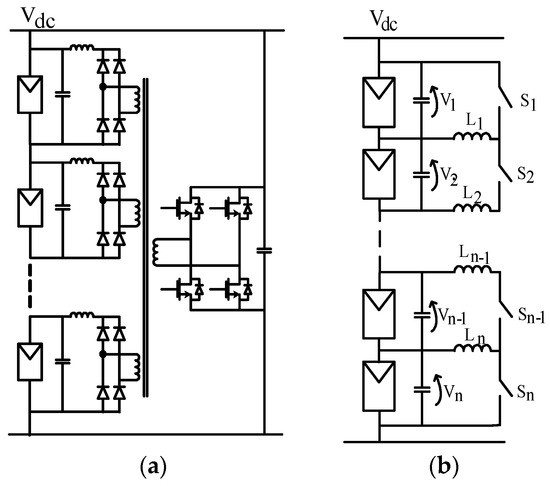 A full-bridge converter with multiple outputs was presented as an example of the Type A GCC—see Figure 17a. This circuit uses ordinary full-bridge rectifiers with unidirectional power flow and preferentially supplies power to a shaded PV module, for which the voltage tends to be lower. Thus, the circuit can inherently alleviate the mismatch and shading effects without the need to apply individual sensing and control functions. As an example of Type B GCC, a multi-stage chopper in Figure 17b was suggested. The chopper has n switches in the string, one per PV panel. The controller turns on all but one switch at a time. Therefore, n switching states are observed within the switching cycle.