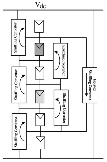 The power loss of a PV string to partial shading can be minimized by applying low-power dc–dc converters, which can “shuffle” power around a problematic module. The converters are wired in overlapping arrangement to shuffle power one level up, as illustrated in Figure 18 [38]. The shuffling converter has to process only the small difference between the powers generated by the adjacent modules. Therefore, while the shuffling converters can significantly increase the power generation under shading conditions, the converter losses have only a marginal effect on the overall system efficiency. However, in the worst case of mismatch, when the PV module has lost all of its generation capacity, the power shuffled by a converter equals that of a PV module so the converter must be rated accordingly. Since the system in Figure 18 is composed of unidirectional converters, it also requires an isolated converter unit to shuffle power from the top to the bottom of the string. The top-to-bottom shuffling unit can be spared when using bidirectional converters such as non-isolated Cuk or buck-boost/flyback converters [39].