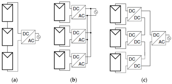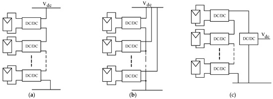 The principle of the optimized string-configured DPVA (OS-DPVA) [24] is configuring the PV modules into several strings with similar power levels. Each string connects to the dc bus through an MPPT dc–dc converter, as shown in Figure 8b. The number of strings is determined according to the number of available dc–dc converters. Under these constraints, the controller evaluates the most productive array arrangement for the given environmental conditions. As the string length is unpredictable, the input voltage to the dc–dc converter may vary widely.