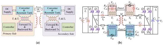 The block diagram of the proposed SWIPT system is shown in Figure 1a. The system is divided into the primary and secondary side. Both sides are supplied by the DC power. The inductive link bridges the primary and the secondary sides. The information is injected into the bidirectional power transfer loop through the signal coupling transformer at both sides, which can achieve the full-duplex transmission of the signal.