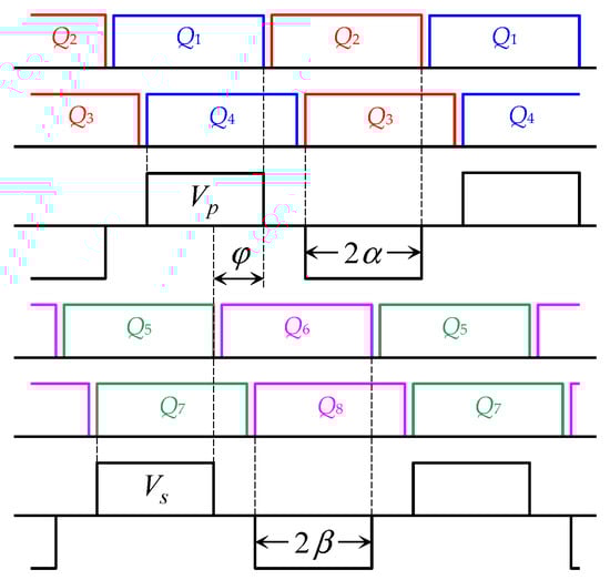 In order to achieve bidirectional power transmission, the SWIPT system adopts dual active full bridges. The power transfer size and direction is controlled by the three phase-shift, α, β, and ϕ, where α and β are half of the inter-bridge phase shift angle of the primary side and secondary sides, respectively; ϕ is the phase shift angle between the primary full-bridge arms and the secondary full-bridge arms, and it can adjust power transmission direction.