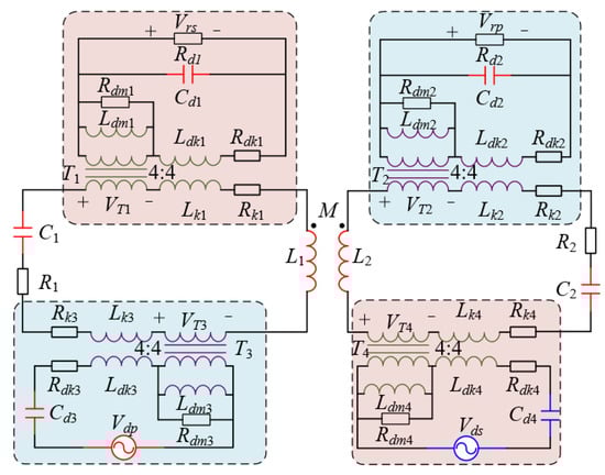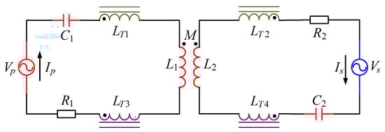 The equivalent circuit models of crosstalk interference between power transfer and information transfer are shown in Figure 8. When analyzing the crosstalk form power loop to information loop, the magnetic coupling interface on the signal modulation and demodulation modules are equivalent to the inductance LT1~LT4. Rep and Res are the equivalent implement of the full-bridge and DC source in the primary side and the secondary side, respectively.