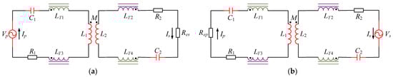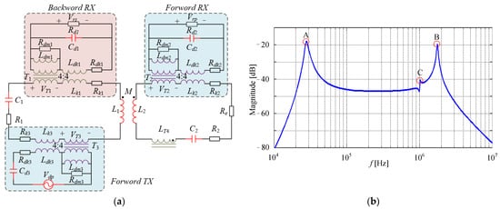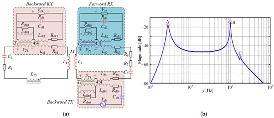The circuit model of the forward signal transmission channel is shown in Figure 5a. For the forward information transfer, the information is injected into the power carrier on the primary side. The information is emitted by the high-frequency source Vdp and amplified by the LC resonant circuit. Then, the power and the information carrier transmit through the common inductive link from the primary side to the secondary side. On the receiver side, the LC circuit is tuned in the forward information transfer frequency to select and amplify the high-frequency carrier signal while attenuating the strength of other carriers.