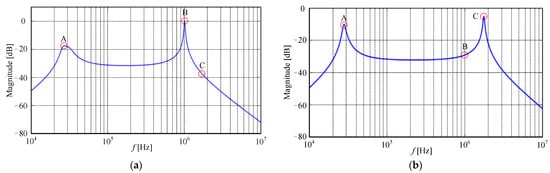 The bode of crosstalk Gsdc(ɷ) is shown in Figure 10b. There are also only two extreme points. Point A is the power carrier, point B and point C are the information transfer gain in ɷds and ɷdp, respectively. Comparing the gain of Gsd(ɷds) and Gsdc(ɷdp), it is clear that Gsd(ɷds) is greater than Gsdc(ɷdp). So, during the process of forward information transfer, the crosstalk from “Forward TX” port to “Backward RX” port can be ignored.