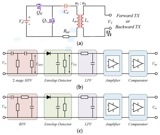 The schematic in Figure 11a is the structure of information modulation. Vd is the DC voltage source. QH and QL make up high bridge inverter. Cd is the compensation capacitor. VT represents a modulated high-frequency voltage source, which is amplified by LC resonance through capacitor Cd and transformer inductor. Through transformer coupling, the high-frequency carrier signal is injected into the power loop through a high-frequency transformer. The receiver circuit in the pick-up side is coincident with the information transmission resonant point to realize the information transmission. After receiving the high-frequency carrier signal, the sampling resistor Vr on the receiving module sends it to the demodulation circuit for signal processing. The structure of demodulation cell is shown in Figure 11b,c.