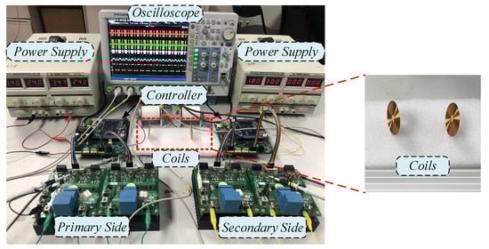 To verify the feasibility and effectiveness of the proposed topology and method, a SWIPT system with air gap of 10 cm and 60 W output power is constructed, as shown in Figure 12, The coupling coil disc has a diameter of 8 cm. There are four signal processing boards, two of them are signal transmitting boards, and the other two are signal receiving boards. The system is designed to achieve simultaneous bidirectional transmission of power and data through a shared channel. The system parameters are shown in Table 1.
