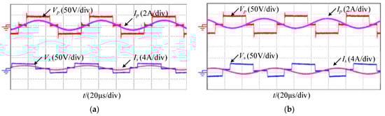 The voltages and the currents are in the same phase. Among them, Vp and Vs are output three-level square wave voltages of the primary side and secondary side. Ip and Is output the sine wave currents on the primary side and the secondary side, respectively. From Figure 13a,b, it can be seen that the voltage and current are in phase. Therefore, both forward and reverse power transmission are normal. In addition, the operating state of the system is resonant. When α = π and β = π, there are only two-level existed in the waveform of Vp and Vs. If α ≠ π and β ≠ π, three-level waveforms appear.
