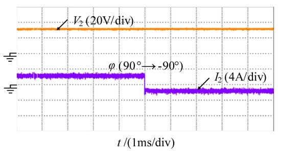 As shown in Figure 14, when the phase shift angle ϕ between the primary and secondary bridge arms changes, the direction of power transmission also changes. When the phase shift angle ϕ between the primary and secondary bridge arms changes from −π/2 to π/2, the direction of the output current I2 changes too. According to the experimental results, by changing the value of ϕ, the forward transmission of the power is changed to the reverse transmission, that is, the bidirectional transmission is completed, which verifies the previous theoretical analysis.