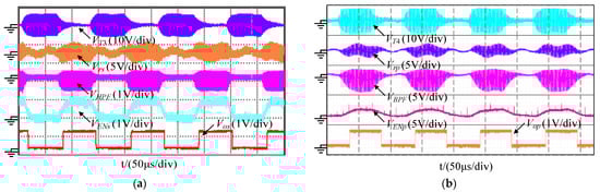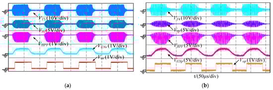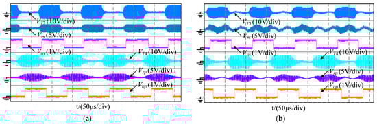 Figure 17a presents the process of simultaneous bidirectional information transmission if there is no power carrier in the circuit. VT3 and VT4 represent the output voltage of tight coupled transformer in primary side and secondary side, respectively. Vrd and Vrs represent the received high-frequency signal and the filtered information signals, which means the information transmission is completed via a shared channel. Vop and Vos are the information waveform obtained from the demodulation circuit in both sides.