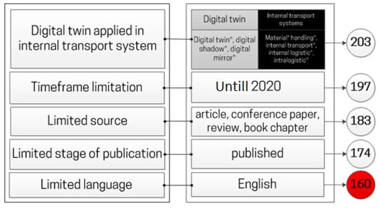 Most analyzed publications were classified as articles, conference papers, reviews, and book chapters; thus, these references were of the author’s interest, resulting in a sample of 183 publications. As this study should represent the actual state of the knowledge on DT applied in internal transport systems and consequently connected to material flow, it was required to take into consideration already published papers. After excluding articles in the press, only 174 records were obtained, and 160 of them were published in English. This set of 160 publications was screened in order to exclude publications that were not associated with the DT applied in internal transport systems.