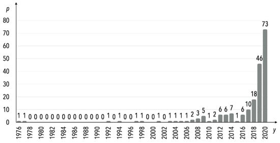 The searching process was limited to publications released until the end of 2020, as the final searching was performed on 18 February 2021. As a consequence, six records published in 2021 were excluded. The dynamics of scientific research on the DT concept in internal transport (material flow) determined over time is provided in Figure 3. According to the keywords applied in the Scopus database, there were 197 publications announced on the DT, digital shadows, and digital mirrors since 1976. However, the origins of the DT concept derived from the 2000s when the idea of a real (physical) space/object and virtual (digital) one connected through data and information flow was introduced by Michael Grieves in the context of product lifecycle management [24]. Namely, the concept was introduced in 2003 [46], therefore considering the stages in the DT research development proposed in [25], it should be considered that there are no significant publications before 2003 (Figure 3). This was also further proved by abstract analysis during the screening stage of the research procedure. Thus, the publications from the period of 1976–2002 were excluded from the research sample during the screening process.
