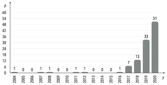 As mentioned earlier, the concept of the DT applied in internal transport systems gains importance over time, especially in recent years. The dynamics of the publications on the topic over time are presented in Figure 5. It is noteworthy that recently, i.e., in the period of 2019–2020, enormous growth in publication number occurred.