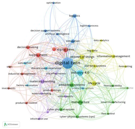 Among subject areas listed in Figure 4, there are also publications assigned to other subject areas, such as Mathematics; Decision Sciences; Business; Management and Accounting; Economics, Econometrics, and Finance. This is related to the fact that some fraternal concepts are closely related to the DT concept (e.g., digital shadow, digital model, etc.). Consequently, the DT concept appears in different subject areas in various contexts. For example, the context of medical research, including research on people and animals, appears in subject areas such as Medicine, Biochemistry, Genetics and Molecular Biology, and Agricultural and Biological Sciences. In Social Sciences, there is a “twin” context understood in relation to human twins. The “digital” context appears in the papers assigned to subject areas such as Materials Science, Energy, Environmental Science, Physics and Astronomy, Earth and Planetary Sciences, Chemistry, and Chemical Engineering. The above-listed subject areas, other than Engineering and Computer Science, are less important in the body of knowledge on the DT applied in internal transport systems and account for a small percentage share of all these publications. Based on the above mentioned, it becomes clear that the DT is a term applied diversely along with the different scientific disciplines and subject areas. This conclusion is also supported by [25], in which authors claimed that research on the DT is related to technological advancement in many areas.