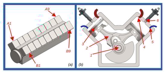 Didactic illustration of the 18V46 engine—(a) positioning of the cylinders—(b) parts of the cylinders.