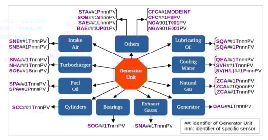 The diagram of Figure 2 presents the division of the a generation unit into its subsystems, named as intake air, turbocharger, fuel oil, cylinders, bearings, lubricating oil, cooling water, generator, natural gas, exhaust gases and others. Each subsystem is further divided into several variables (that contain data from a multitude of sensors installed in the system). In total, each generator unit has 112 variables. The sensors are the same as those already installed in the Wärtsilä supervisory system. The variables also follow the same naming convention (tags) of theWärtsilä system [,]. Table 1 presents a description of the variables.