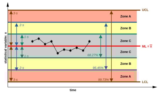 Figure 3 presents an example of the expected behavior of a random variable, plotted as the black curve (called x). The red line (called ML) characterizes the middle line; in other words, it characterizes the average () of the measures of each variable x. The brown lines represent the statistical limits in which the variable is expected to swing in extreme cases, although still under normality. The limits are called the UCL (Upper Control Limit) and LCL (Lower Control Limit) and are determined based on the average and standard deviation s. Three zones (A, B and C) are defined in the figure. Zone C is the region in which the variable deviates from the average in less than one standard deviation (above or below). Zone B is the region in which the variable is between one and two deviations from the average (above or below). Zone A is the region in which the variable is between two and three deviations from the average (above or below). Considering a normal distribution, it is known from probability theory [] (pp. 119–120) that any random variable has a 68.27% chance to be measured in a region limited between two standard deviations (), a 95.45% chance to be measured in a region between four standard deviations () and a 99.73% chance to be measured in a region between six standard deviations (). Hence, if any measurement is obtained outside of six standard deviations, it is considered that this measurement is “outside the control limits”, as this would have only a 0.27% of chance of occurrence.