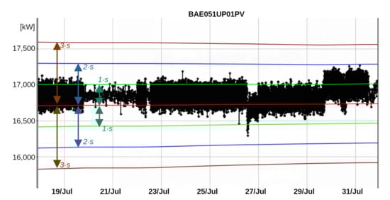 Figure 4 presents the control diagram of the active power (variable BAE051UP01PV). The curve in black represents the variation of the active power in the time window from 17 July 2019 until 31 July 2019, which are the 14 days before the day of the shutdown event (as discussed in Section 3.2). The green lines represent the separation between zones C and B and the blue lines represent the separation between tones B and A. The brown lines represent the LCL and UCL.