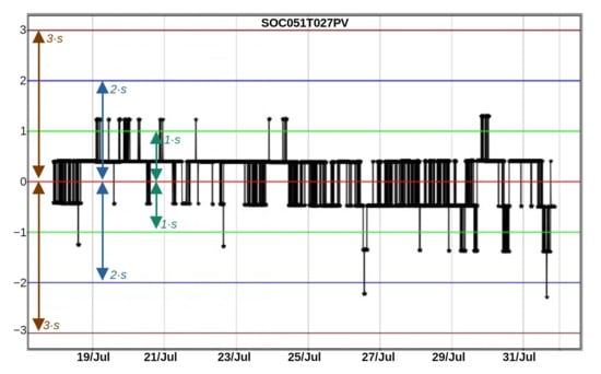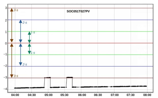 Figure 9 presents the trend of the z-score of the variable SOC051T027PV (the same variable presented earlier in Figure 5) within the time window between 03:57 and 07:58. As expected from Figure 7, within this time window, that variable was outside of the three standard deviations limit for 90% of the time.