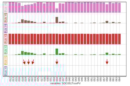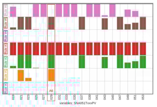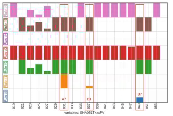 Within the same time window between 13:51 and 14:39, Figure 12 presents the bar graph of the exhaust gases subsystem. The bar graph indicates that rule #0 (blue) was activated for variable SNA051T049PV (temperature sensor for cylinder B7), indicating operation outside three deviation limits. It can also be observed that, concerning variables SNA051T031PV (temperature sensor for cylinder A7) and SNA051T037PV (temperature sensor for cylinder B1), rule #1 (orange) was activated while rule #6 (pink) was not activated, indicating that these cylinders (especially A7) might have shown a trend towards failure.
