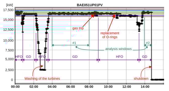 The same generation unit that presented a statistical behavior under normality in Section 3.1 suffered a series of events, including a shutdown, hours after that period. Figure 7 presents the control diagram of the active power (variable BAE051UP01PV). The curve in black represents the variation of the active power in the time window from midnight of 1 August 2019 until 16:00 (4:00 p.m.) of the same day. In order to carry out the validation analysis of the SM, the dates, times and descriptions of the events that occurred in the unit were collected from the logbook (which has manual entries written by the TPP personnel—the most relevant are shown in the figure). The figure also indicates two time windows in which the analyses were performed.