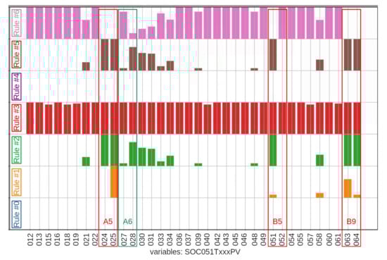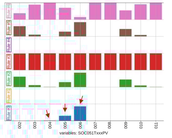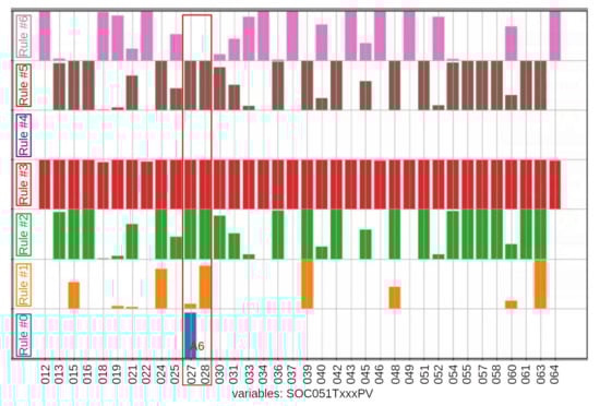 Figure 11 presents the bar graph of the cylinders subsystem after the return to GD mode, until the shutdown (time window from 13:51 to 14:39). It can be observed in the figure that cylinder A6 (variable SOC051T027PV) do not have rule #0 (blue) activated (in comparison with Figure 8), and rule #6 (pink—a rule that indicates normality) was activated. This is an indication that the statistical behavior of this cylinder returned to normality after the maintenance. However, in this figure, it can also be noted that some other variables (SOC051T025PV (one of the two temperature sensors of cylinder A5), SOC051T051PV (one of the two temperature sensors of cylinder B5) and SOC051T063PV and SOC051T064PV (the two temperature sensors of cylinder B9)) showed rule #1 (orange) to be activated and rule #6 not to be activated, which is an indication that, although these variables were still inside the three deviations limits, some tendency towards failure might have appeared.