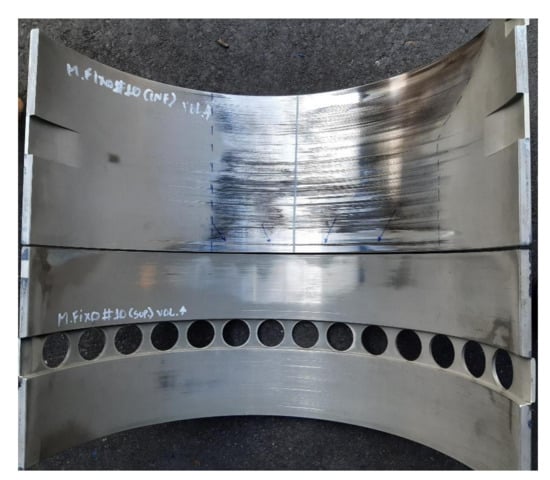 After the shutdown of the engine, it was disassembled, and it was noticed that the bearing shells of several cylinders (not only B7) presented severe abrasion marks, as shown in Figure 13. Under regular conditions, the movement of the connecting rods in relation to the pistons and the crankshafts occurs under a viscous lubricating oil that prevents this kind of abrasion of a metallic part in friction with another metallic part. After an investigation, it was realized that inadequate lubrication had been an issue for some months before the failure.