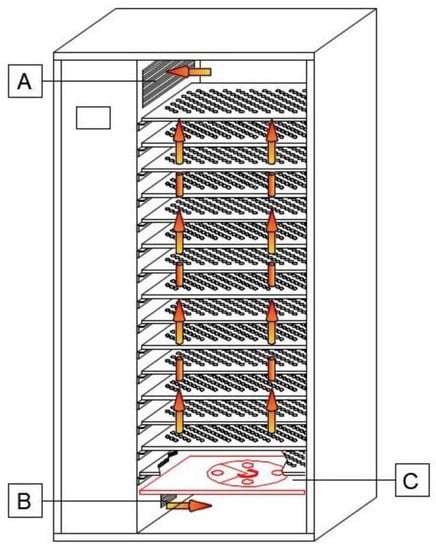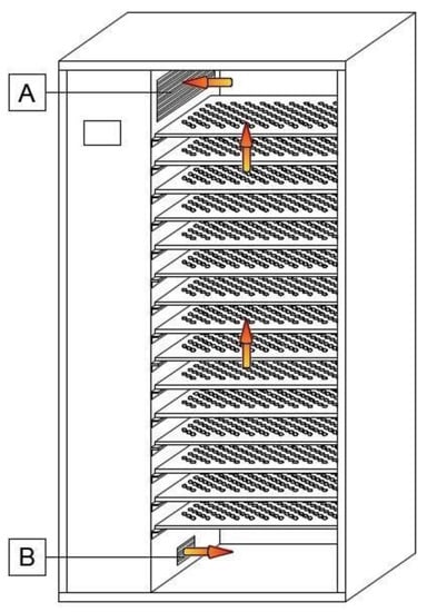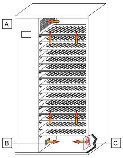 A solution that is able to satisfy the aforementioned requirements concerning product properties, as well as care for the proper performance of the drying process, is the convection chamber (tray) dryer, which is commonly used in food industry for long, but not intensive drying. The advantage of this appliance is the simple structure of the apparatus, which consists of one or several chambers filled with trays. Fans force the movement of the drying air in the chamber. The use of perforated trays causes the air to flow also through the product “bed”, the so-called cross-flow. In order to ensure low flow resistance and pressure drops in the chamber, the distance between the trays/shelves should be approx. 80 mm, and the height of the bed on the shelves varies from 30 to 50 mm. The flow velocity of the drying air stream in the chamber should not exceed 5 m/s, but is typically 1.5 m/s [7,19,29,30].