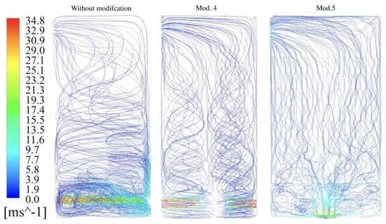 In the unmodified chamber, the streamlines are very dense in the lower section of the chamber. In the upper section of the chamber, an uneven distribution of streamlines is evident, resulting in a concentration in some areas, while other areas remain empty. A non-uniformity of the streamlines has been observed. Furthermore, horizontal air streams dominate in the lower and middle sections of the standard chamber. In modifications 4 and 5 the streams run horizontally only in the lower section of the chamber, gradually changing direction to vertical, which produces the most favorable distribution of air streams. For modification 5, distribution of streams is the most favorable from the point of view of energy transport inside the chamber. Figure 5 represents the results of modelling the velocity field distributions of the drying medium for the classic (factory) chamber and with modification 4 and 5.