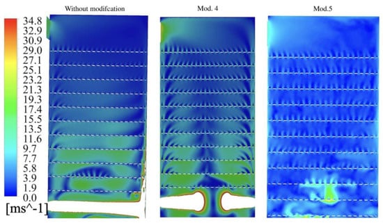 In the unmodified chamber, the highest value of the velocity field is observed in the lower section of the chamber, with the velocity field decreasing as air reaches the trays placed higher in the chamber. A similar pattern is observed in modification (4), but it is apparent that the velocity field in the higher trays has a higher value than in the unmodified chamber. In modification 5, the highest value of the velocity field has been observed adjacent to the openings of the disc through which air is pumped into the chamber by pulsation. In the case of this modification, the velocity field is also most evenly distributed throughout the chamber, irrespective of the height of the trays. Figure 6 represents the results of modelling of velocity vectors of the drying medium for the classic (factory) chamber and with modification 4 and 5.