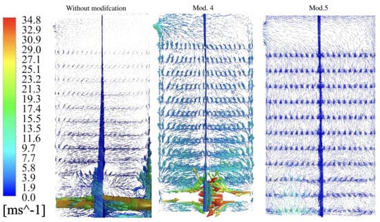 An analysis of the visualization indicated a highly non-uniform distribution of velocity vectors in the unmodified chamber as well as in the chamber with modification 4. The most uniform distribution of velocity vectors was observed in modification 5, in the case of which velocity vectors have a similar value throughout the chamber.