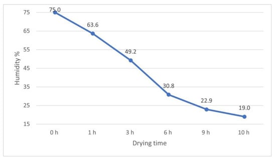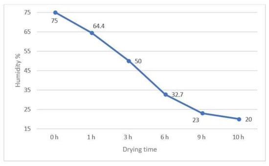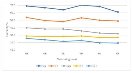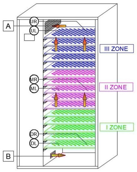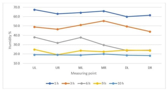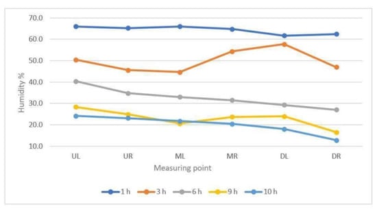 Samples were taken over a period of 10 h at hourly intervals. The drying temperature was 65 °C, the humidity of the medium (air) introduced into the chamber was 20%. Figure 8 depicts the drying chamber divided into 3 sampling zones. Zone I, located in the lower section of the chamber from where DL and DR samples were taken. Zone II, located in the middle section of the chamber from where ML and MR samples were taken. Zone III, located in the uppermost section of the chamber from where UL and UR samples were taken.