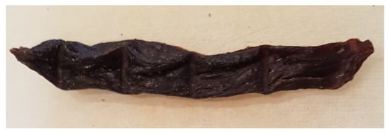 Beef jerky, a product known and appreciated by consumers the world over, should satisfy a number of standards for it to be considered a healthy and safe food. According to the recommendations of the U.S. Food Safety and Inspection Service (FSIS), food products such as beef jerky should have an appropriate ratio of water to protein MPR, i.e., no more than 0.75:1, compared to 4.5:1 for raw meat. Additionally, beef jerky should contain more than 50% protein and no more than 4% fat [6,7]. Water activity in dried meat snacks should not exceed 0.85 [8], whereas achieving a water activity level (Wa) below 0.75 is desirable due to the reduction of growth of yeasts (e.g., Candida, Totulopsis, Ransemla), molds (mycotoxic penicillia), most halophilic bacteria, and mycotoxin-producing Aspergillus molds [9]. In addition, poorly dried meat can harbor E.coli 0157:H7 group bacteria, which is a common cause of food poisoning [10,11].