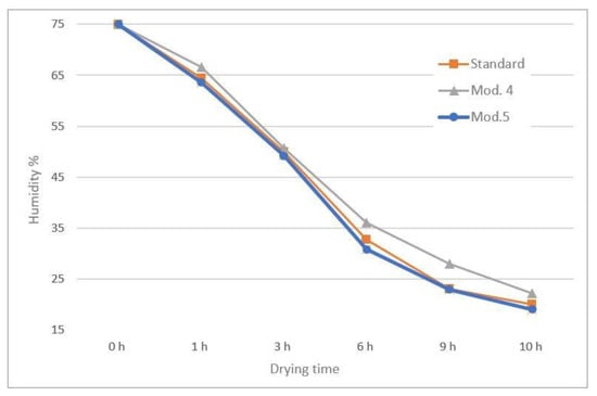 Analysis of drying curves for the three selected solutions of the dryer construction are showed in Figure 13, Figure 14, Figure 15 and Figure 16. After 10 h, meat dried in a chamber with modification 5 obtained an average lowest result of 19% water content (Figure 15), while the highest average value of drying products was observed in chamber 4, and was 22%. Figure 16 shows the drying curve in three analyzed chambers.