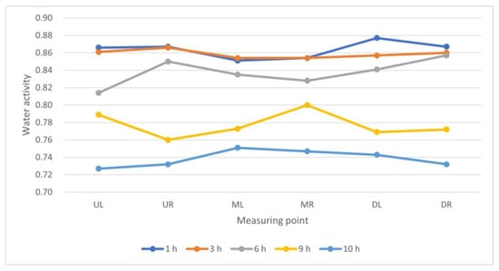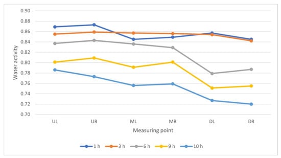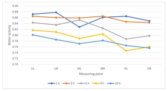 In a standard chamber, differences in water content can be linked to the product placement in the chamber. It can be seen that irrespective of time, there is a significant disproportion between samples taken from the upper left-hand shelf (UL) with the highest water content and samples taken from the lower right-hand shelf (DR) with the lowest water content (Figure 10). The longer the drying time, the more pronounced this disproportion becomes. The greatest difference in product moisture content is seen after 10 h. For the sample taken from UL, the moisture content is more than 11% higher than for the sample taken from DR. Thus, a very significant difference in the degree of meat dryness can be observed depending on the placement in the chamber.