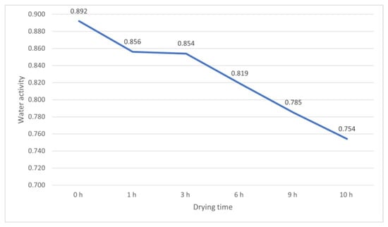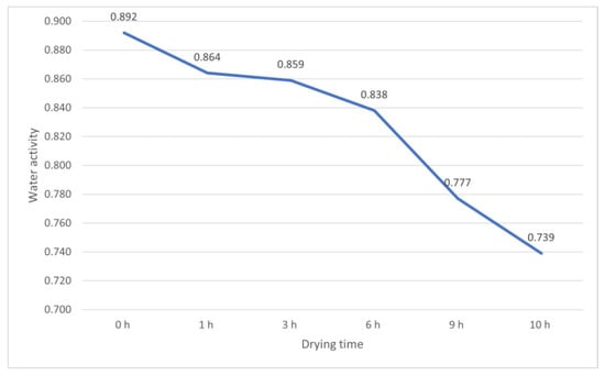 Dried beef snacks, apart from being safe for health reasons, should also be characterized by high quality, characteristic flavor, and a sufficiently long shelf life. Drying meat at too high a temperature causes physical and chemical changes in the product and significantly deteriorate its quality. At the same time, using lower drying temperatures prolongs the process contributing to the growth of undesirable microorganisms and fungi [7,8,11,12]. Furthermore, it is also important to control the drying process in such a way as to obtain the desired organoleptic properties of the snack, determining its quality as assessed by color, flavor, texture and (especially important in terms of product storage) product moisture and water activity [13,14,15,16]. Water activity is understood as the ratio of the water vapor pressure over the product surface to the water vapor pressure over the surface of pure water at the same temperature [3].