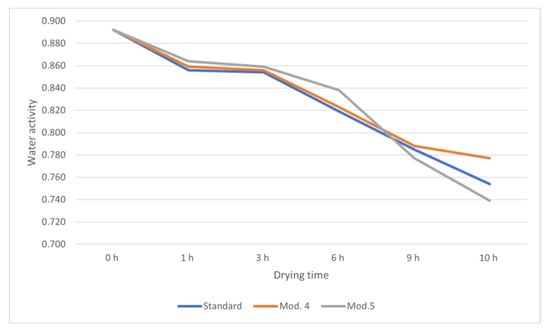 Table 1 presents the results of laboratory tests for three variants of the chamber dryer with heat pump-unmodified chamber (I), chamber with modification 4 and chamber with modification 5. In order to demonstrate the changes in the drying process, the results of water activity (Wa) and water content (Wc) were compared after, respectively: 1 h, 3 h, 6 h, 9 h and after the 10th hour, in which the drying process was completed.