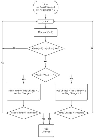 In light of the above observation, the proposed PSD method monitors the consecutive voltage changes across the PV array. Figure 3 illustrates the proposed method with a flowchart. The method calculates the change from the last voltage to the next voltage and counts the number of times a change is consecutively positive or negative. Whenever the sign of successive voltage changes is the same for longer than a specified number (the threshold value) of consecutive changes, the proposed method declares a PSC occurrence. The number of successive changes is determined once and offline by partially shading one PV cell of the panel. While partial shading is applied, the number of successive changes is determined by counting how many times the voltage drops until it becomes stable. In contrast, if the sign of the change in voltage repeatedly alters from positive to negative, then the proposed method does not flag a PSC. To increase the immunity to voltage fluctuations, changes in voltage of less than 0.5 V (0.45% of ) are not taken into account, since they can result from changes in load, fluctuations in irradiance or temperature, or fault transients on the grid.
