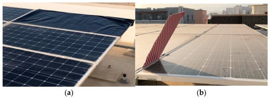 A variety of shading scenarios were simulated to achieve the minimum shading possible in the PV arrays, from shading one PV cell to shading an entire PV panel. Two patterns of PSCs were simulated, namely object shading and cloud shading. Blinding material was used to emulate object shading (see Figure 5b), and tinting material was used to emulate cloud shading (see Figure 5a). During the simulations, the voltage of the PV array was measured every 0.25 s and recorded using the Fluke 435 Power Quality Meter. During the experiment, the sky was clear, the solar light intensity was 350–750 W/m2, and the ambient temperature was around 35 °C.