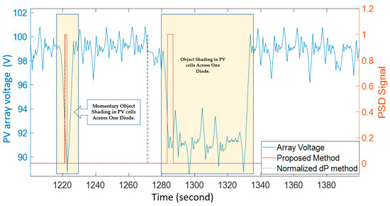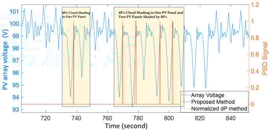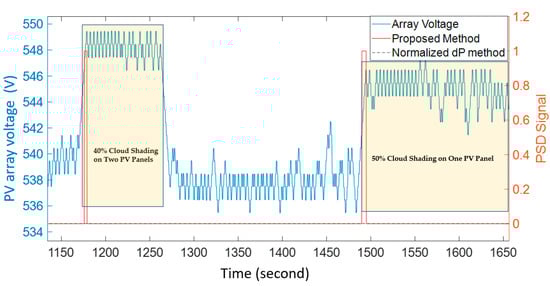 The red line of the proposed PSD output signal, depicted in Figure 8 and Figure 9, shows that the method was successful in detecting this type of shading promptly and precisely in both PV array configurations. On the other hand, the detection method in [,] was not able to detect cloud shading in both PV array configurations for the same reason as mentioned in Section 4.1.