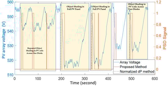 To evaluate the effectiveness of the proposed PSC detection method, its performance was compared with that of the method in [,], which used the ratio of the normalized change in power. Figure 5 and Figure 6 demonstrate the performance of the two methods. The results revealed that the proposed method detected all simulated object shading patterns effectively and accurately in both PV array configurations. In contrast, the other method detected only the shading patterns that cause a high/sudden voltage drop. Moreover, because of the very small change in power, it cannot detect the shading patterns in which a slow drop in voltage occurs. In light of these results, it can be stated that the performance of the proposed method is better and more effective than that of the detection method based on the normalized change in power.
