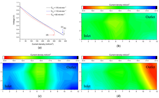 (a) Polarization curves (discharge) for different anolyte flow rates and corresponding current distributions at limiting conditions for (b) VH2 = 170 mL min−1, (c) VH2 = 110 mL min−1, and (d) VH2 = 65 mL min−1. The supply of Br2 solution was fixed to VBr2 = 30 mL min−1.