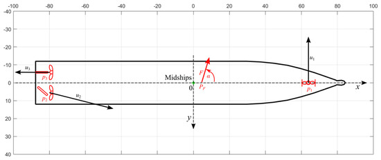 A control system can be described as fully actuated if it is able to command an instantaneous acceleration in an arbitrary direction. If it is not able to command an instantaneous acceleration in an arbitrary direction then such a system is in an underactuated state. In case of ship’s control, the problem is considered to be 3-DOF (degrees of freedom) or solved in 2-dimensional space. Any movement in the z-direction (up/down) or around the x- and y-axis of the ship-body reference frame can be ignored because common actuators of vessels do not have the ability to produce thrust in these directions and most of the manoeuvring situations do not require compensations of heaving, rolling, or pitching. The optimal allocation of forces generated by thrusters is the main problem to be solved by the thrust allocator of such a control system [6,7,8]. In general, the control allocation problem for marine craft is a non-convex optimization problem that is hard to solve [6]. It can be locally approximated with and solved by convex optimization methods [9] depending on the criteria and constraints used.