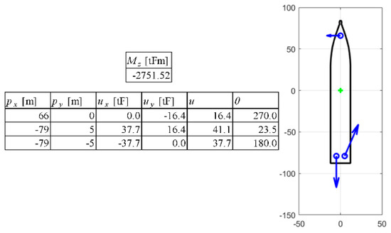 Figure 3 (with the data table attached) shows the example of thrust allocation for the simulated vessel where F = 0 and Mz = −2751.5 tFm. With the aforementioned rudder factor 0.78, the computed thrust angle of 23.5° was converted finally to rudder angle of 19°.