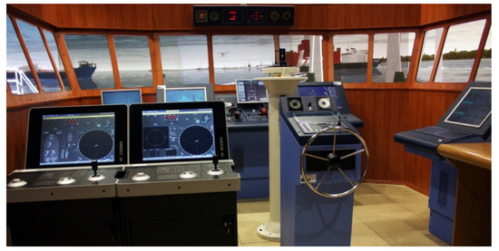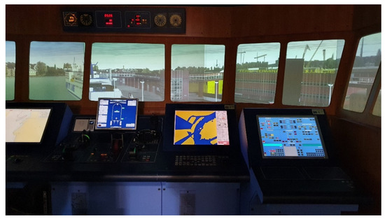 The study was performed in the FMBS of Kongsberg Polaris type [29] in Maritime University of Szczecin, Poland (MUS). The main bridge of this simulator (Figure 4) consisted of 270° vision projectors and mix of real and screen simulated shipborne equipment, including thrusters and rudders’ controls, speed and heading measuring devices, receivers of electronic position fixing systems, electronic chart and display information system (ECDIS), bird’s eye view display, radar equipment, conning station, and DP control stations. There were manual physical controls for two engines with fixed-shaft propellers (of any type), two rudders (of any type, up to max. angle 70°), two azimuth thrusters, and multiple lateral thrusters.