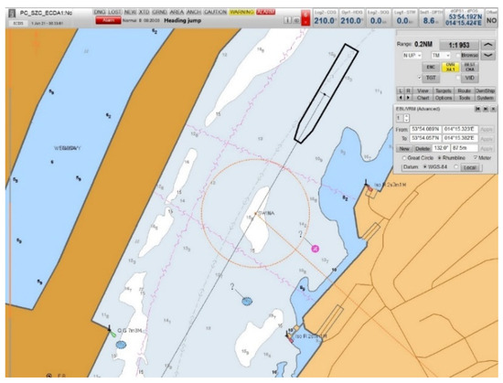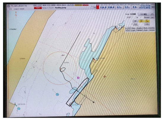 The planned berthing approach trajectory and turning area were marked by the electronic bearing line (EBL) and the variable range marker (VRM) in the simulator’s ECDIS (Figure 6) in order to force the navigators to follow the established manoeuvring tactics.